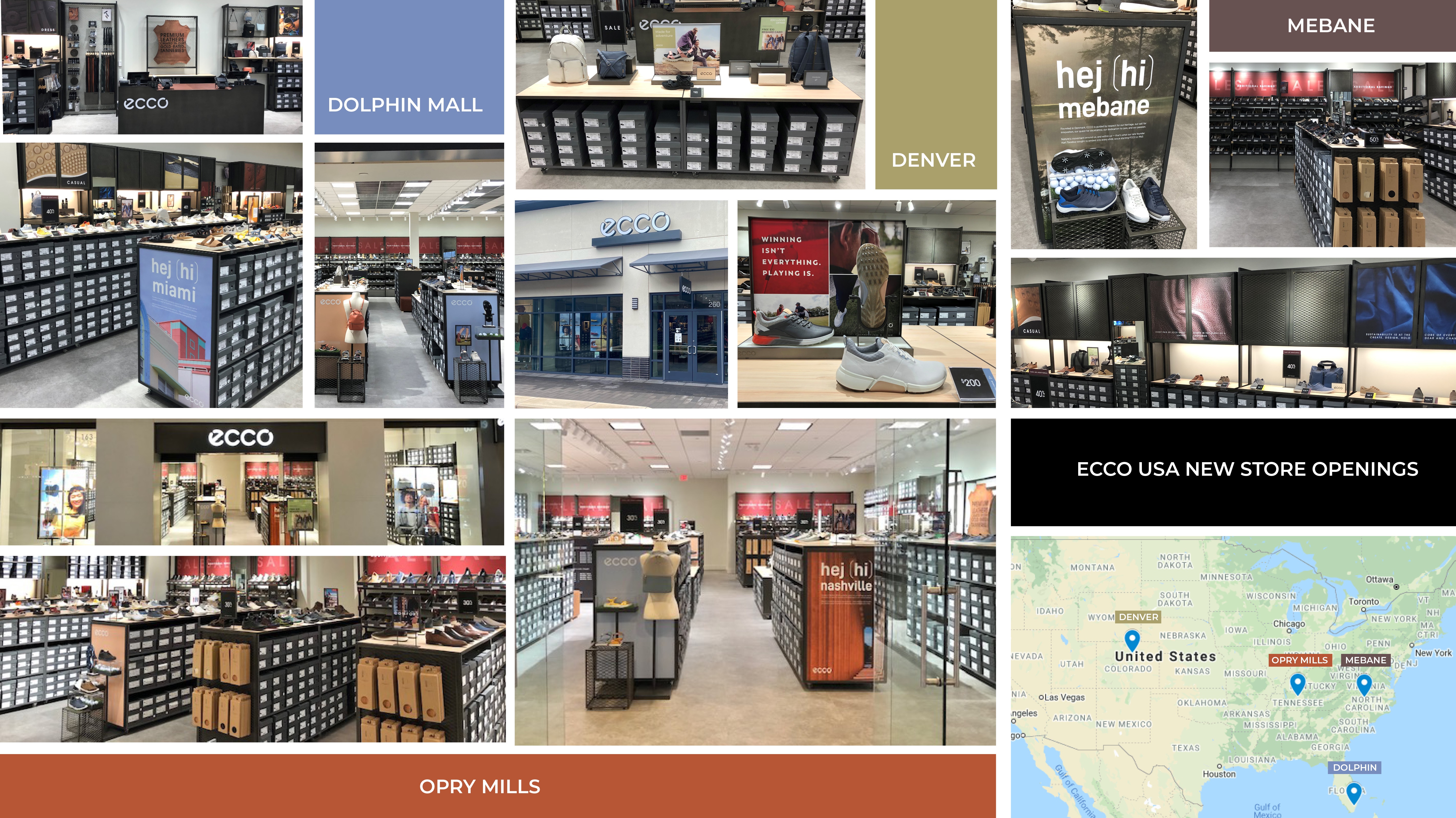 ECCO has opened four outlet shops this spring across the US in Dolphin Mall, Miami; Opry Mills, Tennessee; Denver, Colorado; and Mebane, North Carolina.